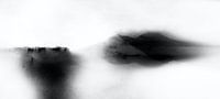 Een abstract berglandschapschilderij van zachte organische geometrische bergvormen met lichte expressionistische textuur in wit, ivoor, grijs, inktzwart en houtskoolzwart monochroom met een impressie van Japanse kunst en kunst uit Noord-Europa.