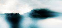 Een abstract berglandschapschilderij van zachte organische geometrische bergvormen met lichte expressionistische textuur in warm grijs, grijs, donker marineblauw, donker indigo, inktzwart en houtskoolzwart met een impressie van Japanse kunst en kunst uit Noord-Europa.