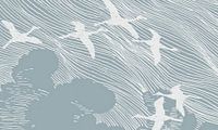 Japanse kraanvogels in vlucht in een rustgevend landschapsschilderij op een aangename monochrome achtergrond met een diepe vintage textuur.