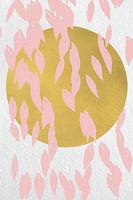 Abstract botanisch landschap met gouden zon en bladeren, twijgen, takken in pastelkleur