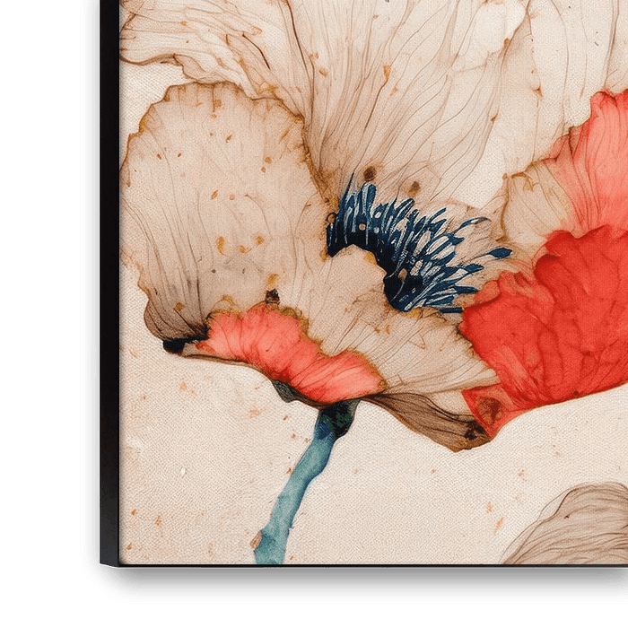 Grote, doorschijnende bloemblaadjes van de Papaverbloem in zacht ivoorwit en bleke beige/bruine tinten creëren een fragiele look. Dit wordt gecontrasteerd door een opvallende streep fel koraalrood/oranje-rood en een diep kobaltblauw/indigo in het hart van de bloem.