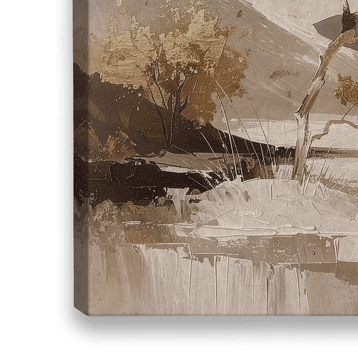Dit Japanse berglandschap combineert de traditionele Japanse esthetiek met een moderne, abstracte stijl.