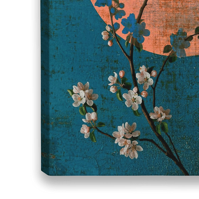Koop dit abstracte kunstwerk Japandi Art: Tak met kersenbloesem en volle maan (Mixed media) van Studio Pieternel op canvas, aluminium dibond, (ingelijste) fotoprint, behang en ArtFrame, op maat geprint in Fine-Art kwaliteit.