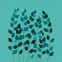Dit kunstwerk is een grafische, gestileerde weergave van eucalyptustakken, tegen een levendige turquoise of aqua achtergrond (Japanse Tsumugi textuur).