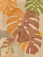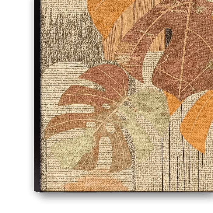 De bladeren overlappen elkaar en bevatten grafische texturen en lineaire patronen. Het werk combineert een tropisch thema met een Japandi/Scandinavische of bohemien sfeer door het gebruik van de gedempte, natuurlijke kleuren en textuur.