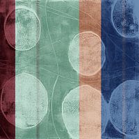 Deze serie abstracte vormen in gedempte kleuren is gemaakt met behulp van monotypetechnieken met acrylverf. Elk werk toont gelaagde vormen - cirkels, ovalen en blokken - gerangschikt in gestructureerde lay-outs. De lijnen zijn zacht en imperfect, met zichtbare texturen van het drukproces. Het kleurenpalet bestaat uit stoffig groenblauw, olijfgroen, roestrood, houtskoolblauw, donker terracotta, warm geel, koraal, zacht paars, neonblauw, zacht beige en gedempt terracotta. Deze afgezwakte tinten geven de kunstwerken een geaarde en natuurlijke uitstraling.