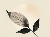 Planten in monochrome kleuren en abstracte texturen smelten samen in een mixed media kunstwerk geïnspireerd door Japandi stijl en Wabi Sabi kunst.