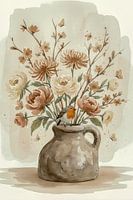 In het beeld zie je een roodborstje dat op de rand van een stenen, keramische kruik zit. Achter en rondom de vogel staat een vol bloemboeket in zachte aardetinten zoals beige, bruin en crème, aangevuld met gedempte groene bladeren. Kleine vlinders en lichte, spetterende texturen zweven tussen de bloemen en geven beweging aan de…