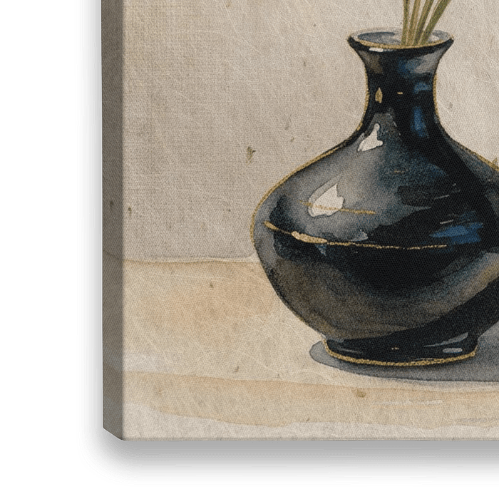 Japandi Art Japanse bloemschikkunst van een rijstplantje in een platte zwarte vaas in Ikebana stijl met aquarel effect.