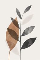 Een minimalistische illustratie met een abstract bladvormig ontwerp, met neutrale tinten van grijs en bruin op een lichte achtergrond, geïnspireerd op de gedurfde kleurenpalet van Matisse. Het ontwerp combineert gedempt grijs en diep beige voor contrast, met de focus op de eenvoudige vorm en silhouet van bladeren. Het is geschikt als wandkunst of decoratie in verschillende omgevingen.