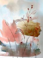 Dit expressieve kunstwerk combineert de vloeiende eigenschappen van aquarel met de precisie van lijnwerk, wat resulteert in een eigentijds en sfeervol beeld. Het werk straalt een sfeer van abstracte natuur, rust en moderne elegantie uit.