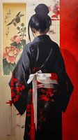 Een digitaal vervaardigd schilderij, een collage van diverse afbeeldingen. Samen vormen ze een sfeervol portret van een Japanse vrouw in kimono, op de rug gezien.