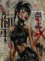 Dit werk toont een jonge Japanse vrouw met een gedurfde en expressieve uitstraling, tegen een achtergrond van abstracte en stedelijke kunst met Japanse invloeden. Ze heeft donker haar dat in een hoge paardenstaart is gebonden, en haar make-up is opvallend, met rode accenten rond haar ogen en felle rode lippenstift. Haar gezicht en…