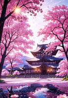 Te midden van de vallende bloemblaadjes van de kersenbloesem staat een grote tempel in stille harmonie met de natuur. De zon filtert zachtjes door de roze takken en verlicht de traditionele houten daken met een gouden gloed. Reflecties dansen over de vijver beneden, waar de bloesems als vluchtige dromen rondzweven. Sanctuary of Blossoms roept rust, eerbied en de tijdloze schoonheid op van de lente in Japan, waar het heilige en het natuurlijke in elkaar overlopen.