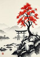 Een sereen aquarelschilderij verbeeldt een traditioneel Japans landschap. Een levendige rode kersenbloesemboom staat prominent op een rotsachtige oever, de takken reiken naar een mistige bergketen op de achtergrond. Een traditionele torii poort, een symbolische ingang naar een Shinto heiligdom, staat gedeeltelijk ondergedompeld in het kalme water van een meer.