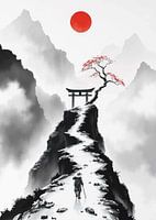 De afbeelding toont een sereen landschap in Japanse stijl met een monochroom kleurenschema, geaccentueerd door een levendige rode zon. Een eenzame figuur loopt over een besneeuwd pad dat een berg oploopt naar een traditionele Torii poort. Bij de poort groeit een bloeiende boom met rode bloemen. Op de achtergrond zijn mistige bergen te zien, die een rustige en contemplatieve sfeer creëren.