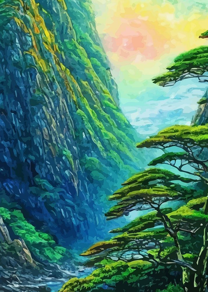Een rustig Japans eiland, weelderig met levendige groene vegetatie, strekt zich vredig uit onder een zachte, blauwe hemel. In het hart van het eiland staat een traditioneel heiligdom met een rode torii poort, verscholen tussen de bomen en omgeven door de natuur. De oliepasteltechniek brengt de scène tot leven met delicate mengingen, die de vloeiende rondingen van de heuvels en de gedetailleerde texturen van het heiligdom benadrukken. Zachte groentinten domineren het landschap, terwijl de rustige sfeer uitnodigt tot een gevoel van sereniteit en spirituele harmonie.