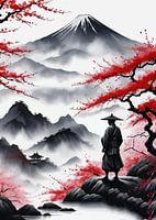 Een sereen Japans landschapsschilderij met het silhouet van een samoerai tegen een mistige achtergrond. Torenhoge bergen doemen op in de verte, terwijl kersenbloesems zachtjes bloeien rond de scène, hun zachte bloemblaadjes voegen een gevoel van rust toe. De mist omhult het landschap en creëert een sfeer van mysterie en stille kracht.