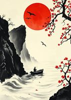 Deze afbeelding toont een sereen landschap in Japanse stijl met een grote rode zon die de hemel domineert. Een eenzame visser is te zien in een kleine boot op het water, met rotsachtige kliffen aan de ene kant en bloeiende takken aan de andere kant. Vogels vliegen door de lucht en dragen bij aan de rustige sfeer. Het kleurenpalet wordt…
