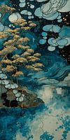 Ervaar de serene schoonheid van het Oosten met dit betoverende werk. In een harmonieus samenspel van wit, blauw en zwart ontvouwt zich een verstild tafereel: een eenzame boom met gouden bladeren staat centraal, zijn silhouet elegant afgetekend tegen een achtergrond van kabbelend water en majestueuze bergen. De subtiele toepassing van verf die zachtjes naar beneden stroomt, creëert een gevoel van beweging en vergankelijkheid, kenmerkend voor traditionele Japanse esthetiek.