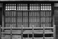 Lijnenspel van horizontale en vertikalen lijnen en panelen in traditioneel houtsnijwerk, oude gevel met ramen en vensters van rijstpapier in de wijk Gion in Kyoto (Kioto), Japan. Deze Japanse houten bouwstijl dateert uit de historische Edo periode.