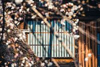 Close up van een Japans raam met rijstpapier en kersenbloesem in het dorpje Shirakawa-go in de Japanse Alpen.