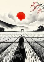 De afbeelding toont een Japans landschap met een samuraifiguur die door een rijstveld loopt. De scène is weergegeven in een monochrome stijl, voornamelijk zwart en wit, met een opvallende rode zon in de lucht. Een traditionele Torii poort staat in de verte, omlijst door bergen en wolken. Een tak met rode bloemen is zichtbaar in de rechterbovenhoek.