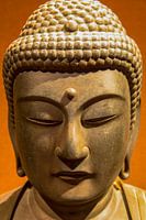 Close up van zeer oude japanse Buddha beeld met oranje achtergrond
