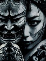 Over ‘Japanse Gemaskerde Vrouw Muurkunst - Donkere Tattoo Realisme Portret Moderne Print’ van Ramy Salah Hefny