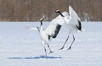 Dansende en roepende Japanse Kraanvogels op een mooie winterse dag op een met sneeuw bedekt veld nabij Kushiro in het zuidoostelijke deel van Hokkaido, Japan.