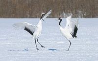 Dansende en roepende Red Crowned Cranes op een mooie winterse dag op een met sneeuw bedekt veld nabij Kushiro in het zuidoostelijke deel van Hokkaido, Japan.