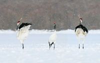 Dansende en roepende Red Crowned Cranes op een mooie winterse dag op een met sneeuw bedekt veld nabij Kushiro in het zuidoostelijke deel van Hokkaido, Japan.