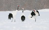 Dansende en roepende Japanse Kraanvogels op een mooie winterdag op een met sneeuw bedekt veld nabij Kushiro in het zuidoostelijke deel van Hokkaido, Japan.