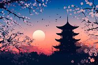 Een zachte zonsondergang hult het landschap in zachte pastelkleuren, terwijl een majestueuze pagode op de voorgrond troont. Omringd door delicate kersenbloesems straalt het beeld gracieuze rust en elegantie uit het Verre Oosten uit. Ideaal voor de woonkamer, het creëert een ontspannen sfeer en nodigt uit om te dromen.