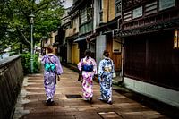 Kleurrijk geklede Japanse dames in een historisch straatje in Kanazawa, Japan. Deze stad wordt vanwege zijn authentieke sfeervolle buurtjes ook wel "klein Kyoto" genoemd.