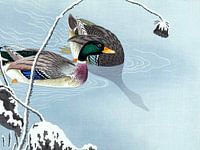 Een Japanse illustratie van twee eenden op een blauw-grijs meer en handgeschilderde achtergrond.