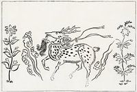 Japanse vintage woodblock print uit Yatsuo no tsubaki (1860-1869) door Taguchi Tomoki. Yatsuo no tsubaki is een Japans boek uit de late Edo-periode (江戸後期刊) met houtsneden, uitgegeven door Taguchi Tomoki.