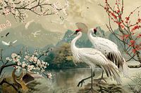 Digitaal schilderachtig fictief beeld van paradijsvogels met kersenbloesem in de lente in een Japanse tuin