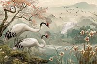 Digitaal schilderachtig fictief beeld van paradijsvogels met kersenbloesem in de lente in een Japanse tuin