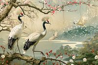 Digitaal schilderachtig fictief beeld van paradijsvogels met kersenbloesem in de lente in een Japanse tuin