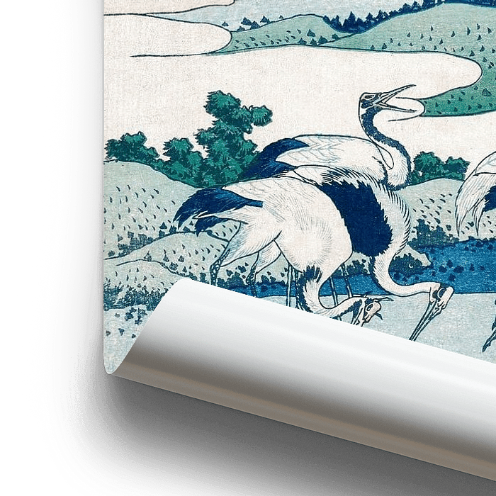 Katsushika Hokusai Umezawa Manor in Sagami Province (1830-1833) vintage houtgravure. Blauw en groen Japans landschap met berg en kraanvogels. Origineel is in het Minneapolis Institute of Art. Aziatische kunst. Vintage. Traditionele Japanse kunst. Kleur houtsnede. Japandi, Landelijk, Nieuw Landelijk, Boheems, Retro, Zen woonstijl.