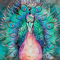 Een expressionistische illustratie van een Japanse pauw in krachtige kleuren tegen een prachtig geschilderde achtergrond met zachte textuur.