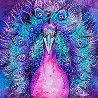 Een expressionistische illustratie van een Japanse pauw in krachtige kleuren tegen een prachtig geschilderde achtergrond met zachte textuur.