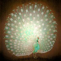 Een Japanse illustratie van een pauw in natuurlijke kleuren en groenblauw cyaan tegen een met de hand geschilderde achtergrond.