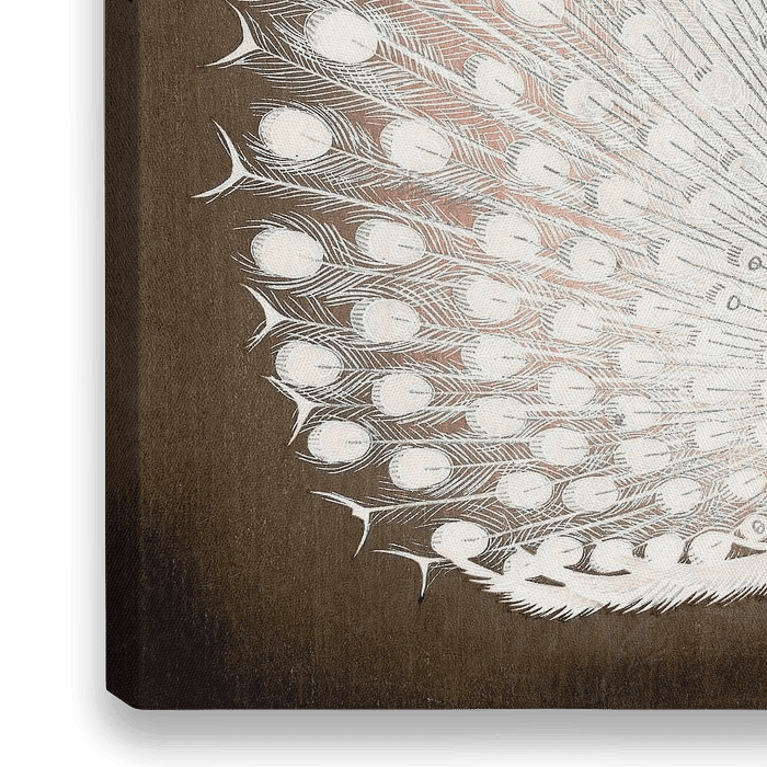 Een Japanse illustratie van een pauw in natuurlijke kleuren tegen een met de hand geschilderde achtergrond.