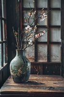 De zorgvuldige plaatsing van elk element op de tafel getuigt van een diepgaand respect voor evenwicht en symmetrie, en nodigt uit tot contemplatie en introspectie. Elk detail is doordrenkt met betekenis, van de verweerde textuur van de houten tafel tot de delicate nuances van de bloemblaadjes. Dit stilleven nodigt ons uit om de schoonheid te waarderen in de eenvoud van het alledaagse en herinnert ons eraan om te vertragen, te ademen en te genieten van de momenten van rust en sereniteit die het leven te bieden heeft.