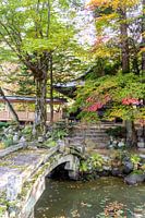 Japanse tuin met brug over een klein vijvertje tijdens de herfst met gekleurde bladeren. In de achtergrond is een tempel met een loopbrug.