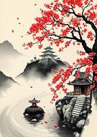 De afbeelding toont een serene Japanse tuin met een traditioneel gebouw in pagodestijl temidden van weelderig groen en een kronkelende rivier. Een grote kersenbloesemboom met levendige rode bloesems domineert de rechterkant van de afbeelding, de takken reiken naar de hemel. De scène is geschilderd in een minimalistische stijl met…