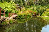 Voorjaar in de Japanse tuinen met oosterse ornamenten, zoals een pagode en bruggetjes op het landgoed Powerscourt, Enniskerry, County Wicklow, in Republiek Ierland.
