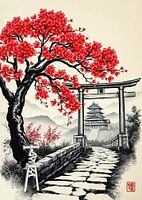 Een traditioneel Japans schilderij toont een sereen landschap met een levendige kersenbloesemboom op de voorgrond. De takken van de boom zijn overladen met felrode bloesems die afsteken tegen de zwarte en witte tinten van de omgeving. Een stenen pad leidt naar een traditionele Japanse poort, bekend als een torii, die een verre tempel…